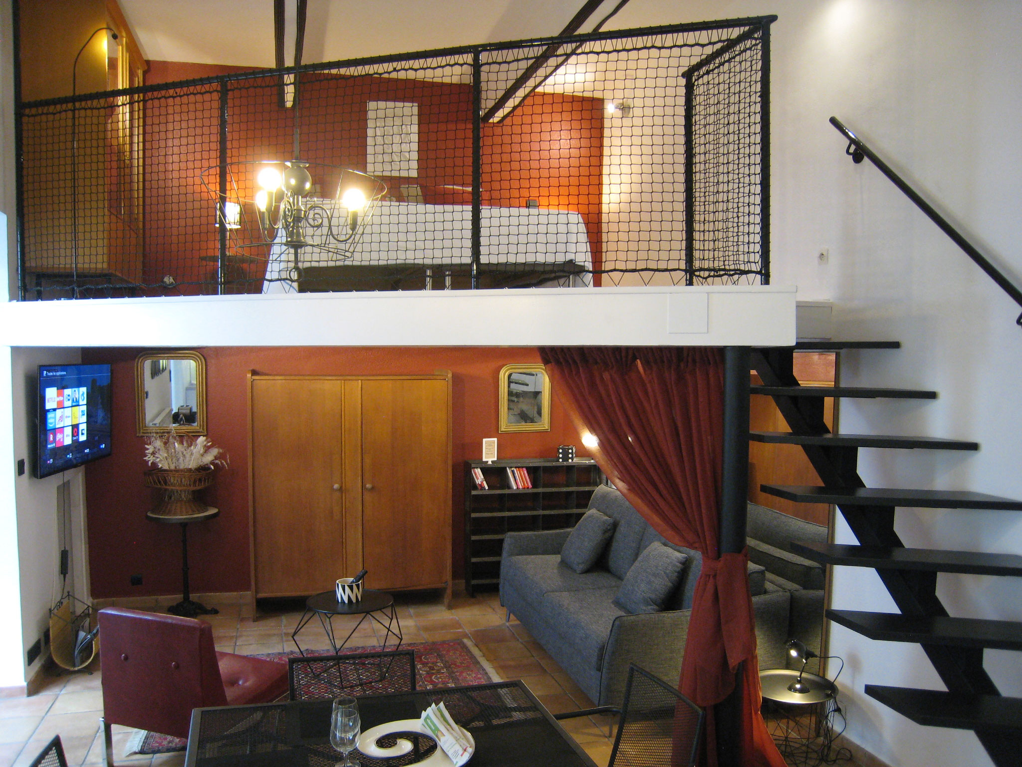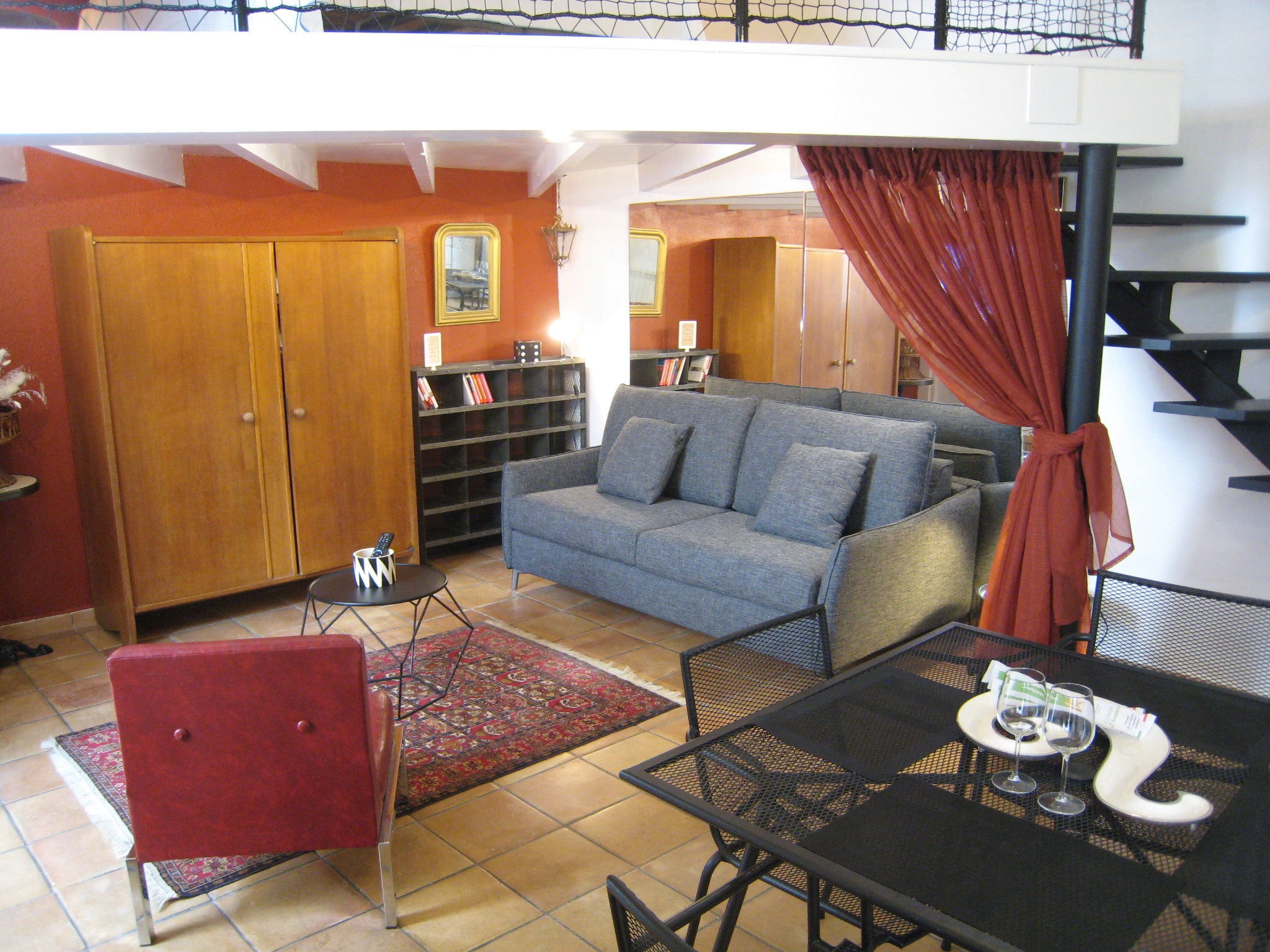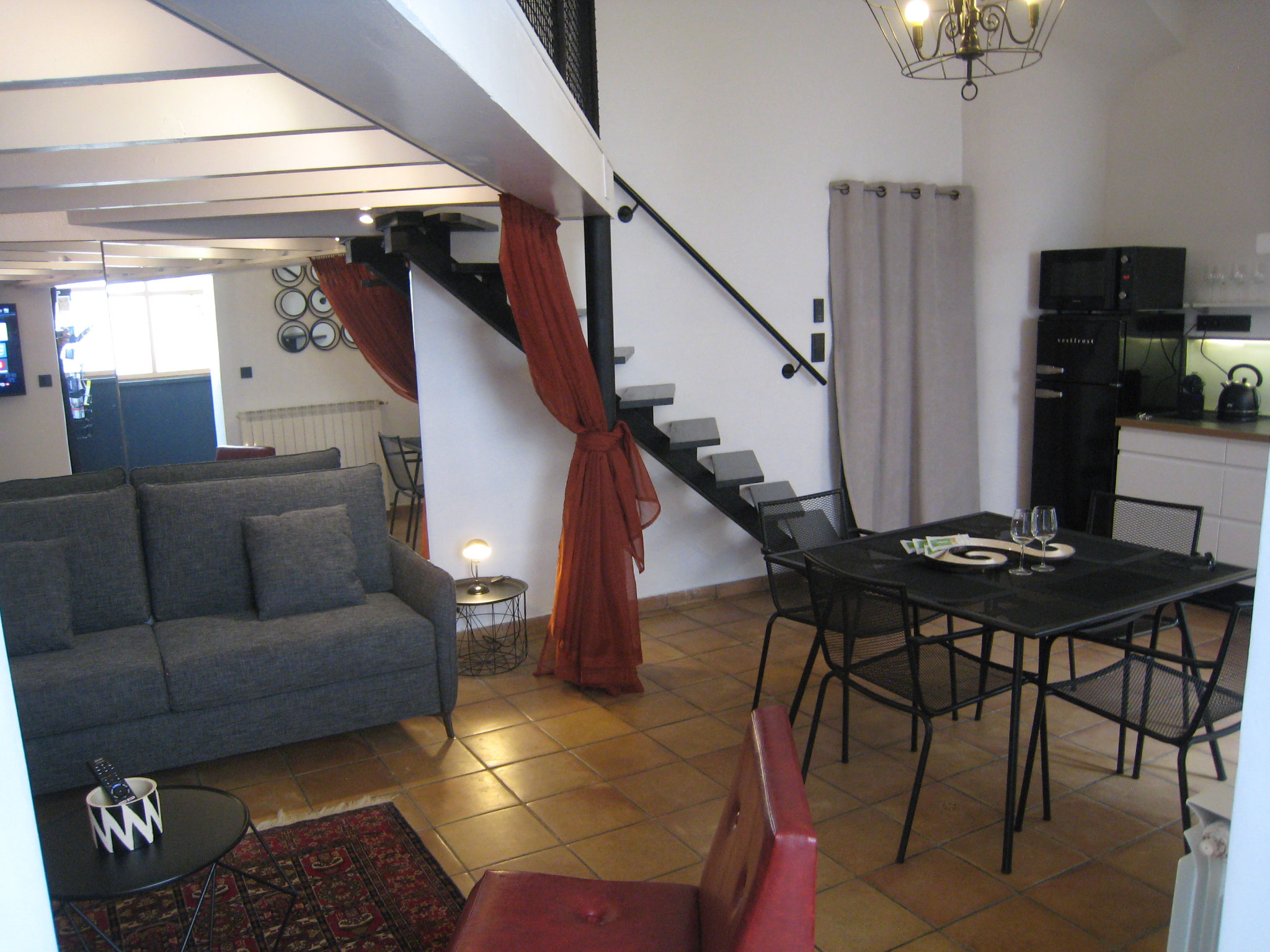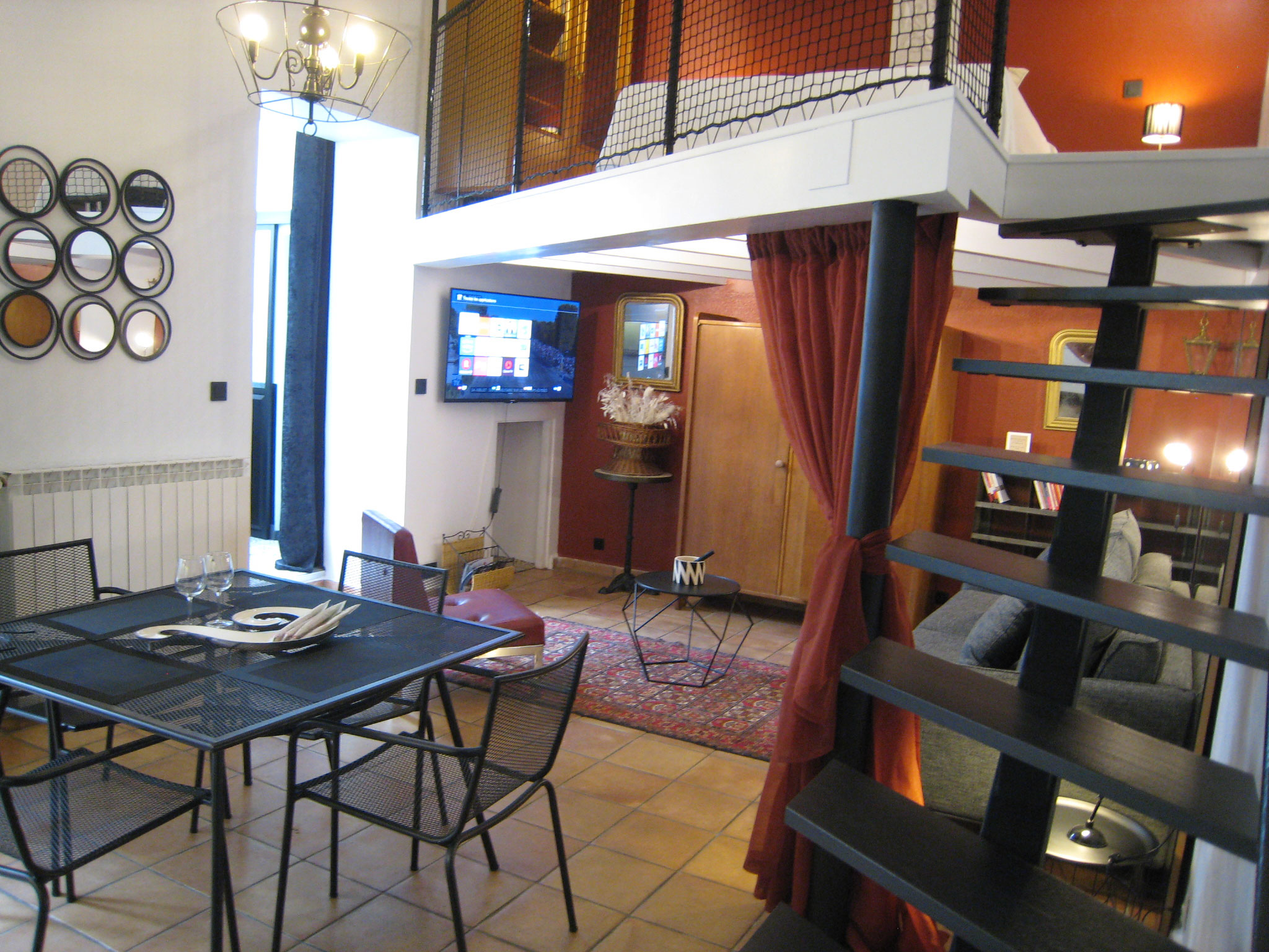 Un bel appartement de type studio/mezzanine avec une hauteur sous plafond de 4 mètres d'une surface de 35m2 au sol avec la mezzanine de 11m2 desservie par un bel escalier en fer et bois crée par un artisan ferronnier! Une belle cuisine surmontée d'une hotte et entièrement équipée (réfrigérateur/congélateur***, plaque de cuisson gaz, lave vaisselle, four micro-ondes multifonctions, grille pain avec bouilloire plus machine à café Nespresso. De plus, elle est fournie d'un ensemble d'ustensiles de cuisine plus vaisselle complète. Le coin repas est composé d'une table pour quatre personnes. Le salon est situé sous la mezzanine et est équipé d'un canapé-lit de la marque "La Maison du Convertible" qui permet, en deux secondes de le transformer en un grand lit de 160x200 avec un matelas (mémoire de forme) d'une épaisseur de 13cm! Un coin bureau donnant sur la cour plus la salle d'eau toute neuve avec douche à l'Italienne complète ce bel appartement.