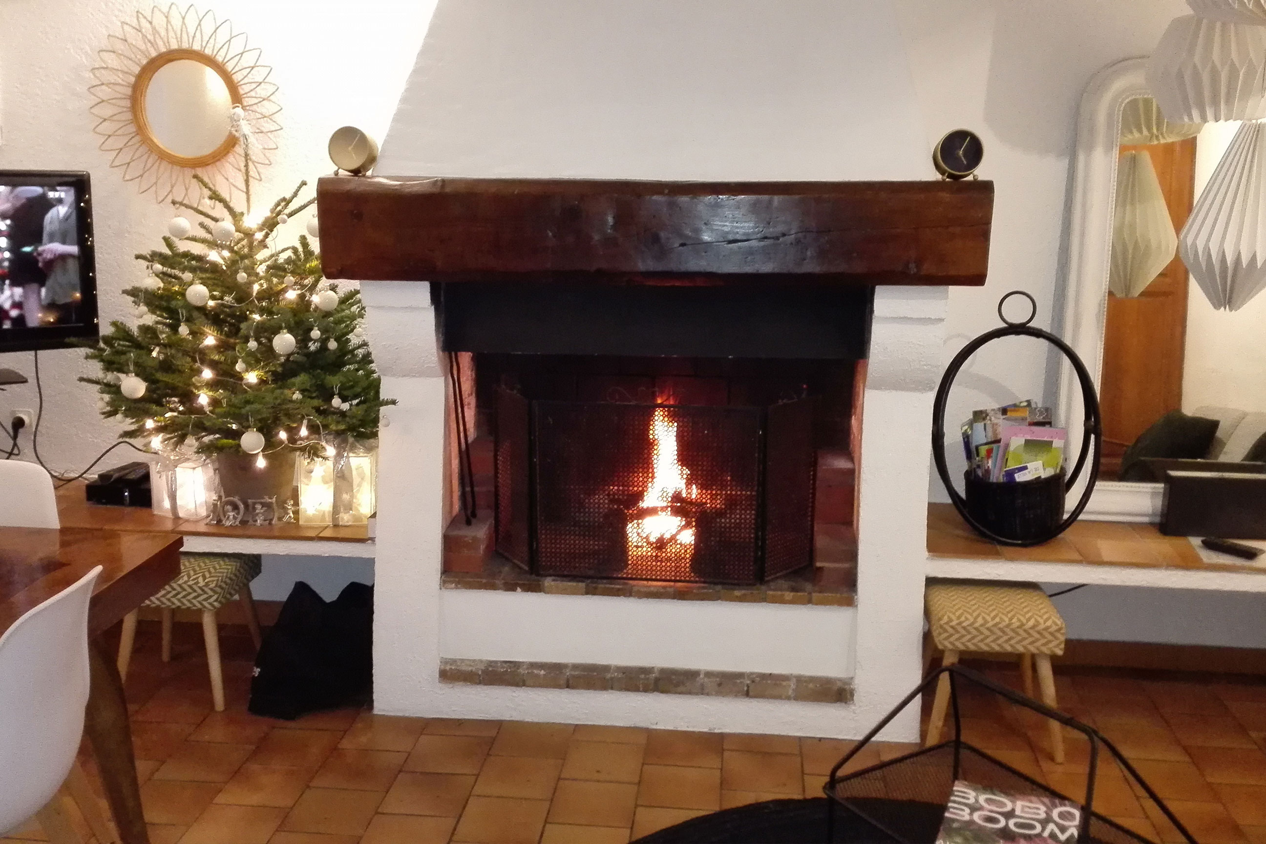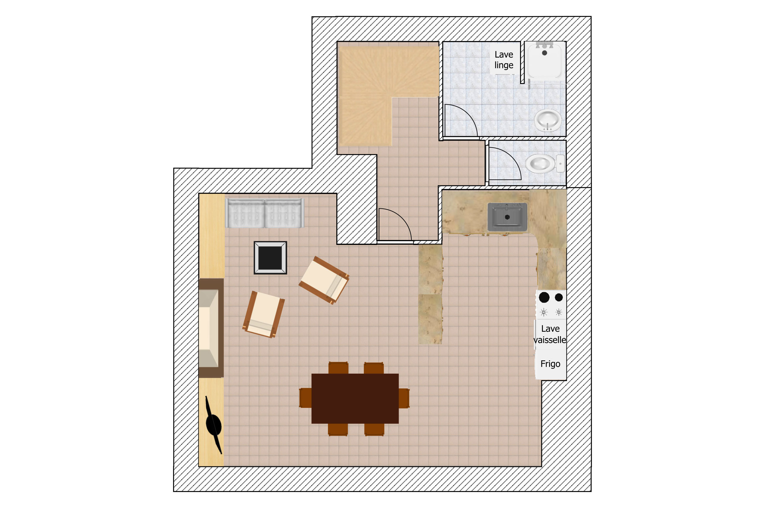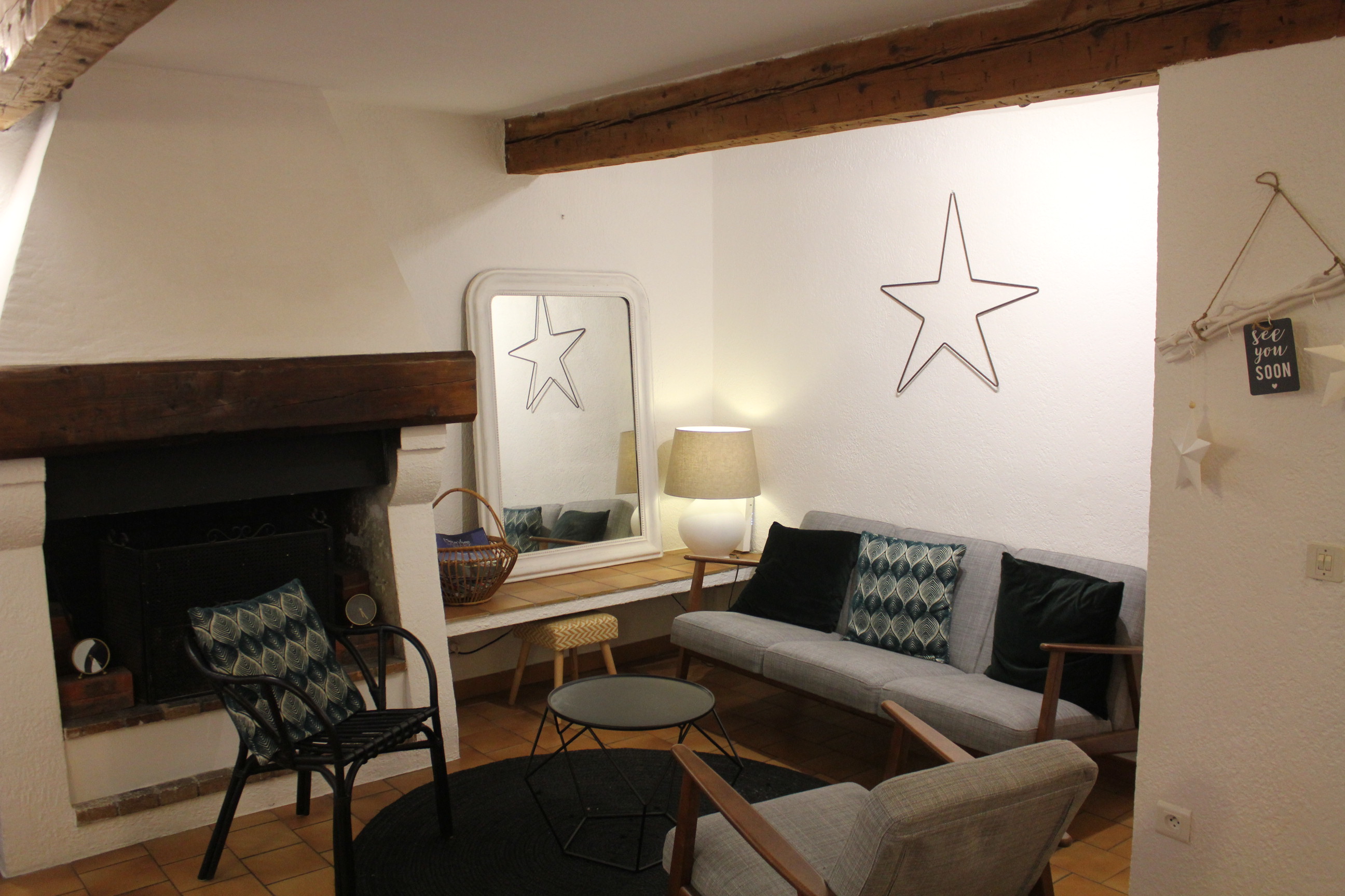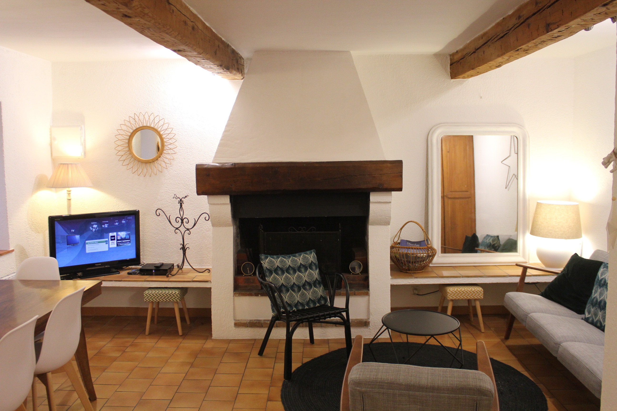 Elle se compose d'une entrée qui donne sur la cuisine entièrement équipée (Lave Vaisselle, Four, Frigo, Plaque élec., et ouverte sur le salon avec coin repas équipé d'une belle cheminée et poutres apparentes (surface totale pour environ 30m2).