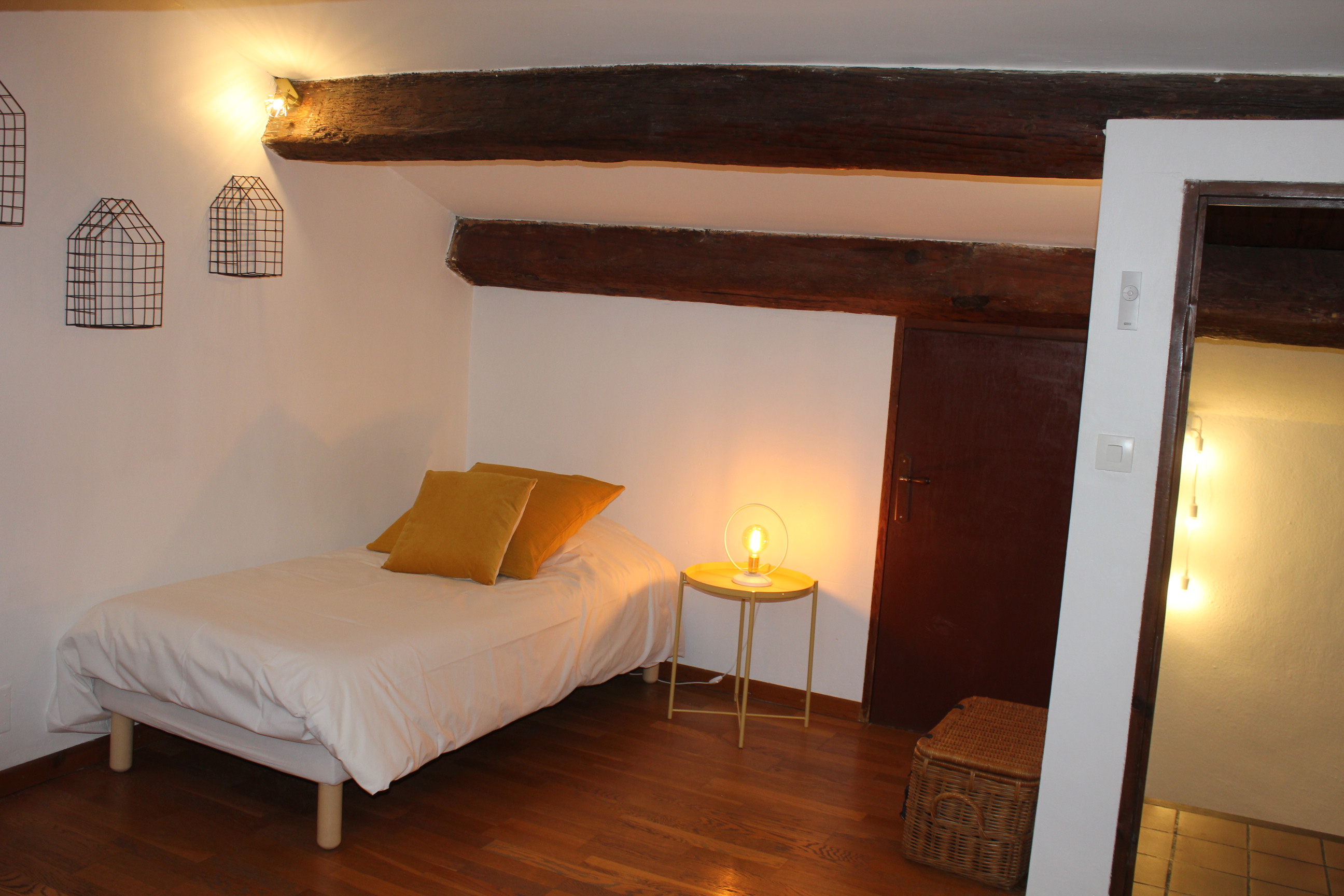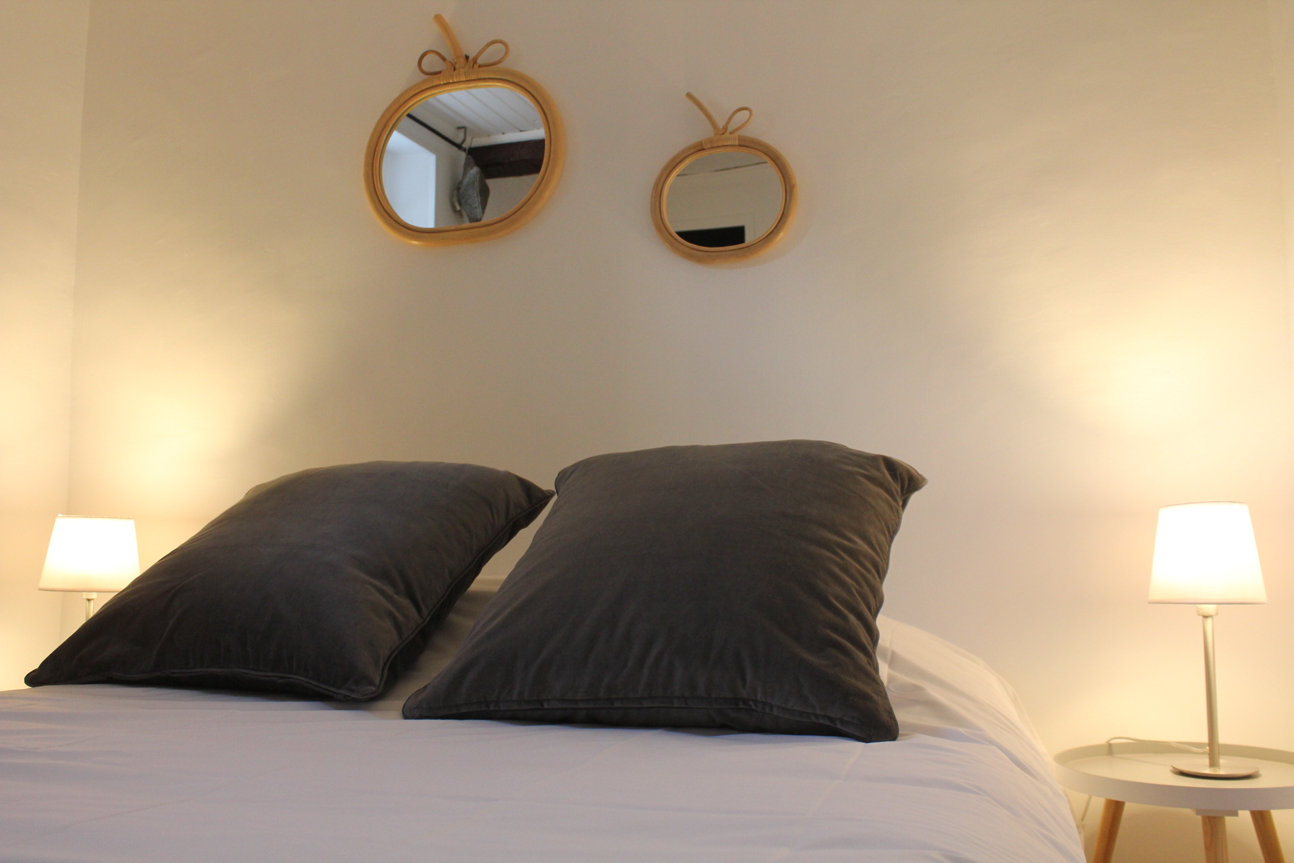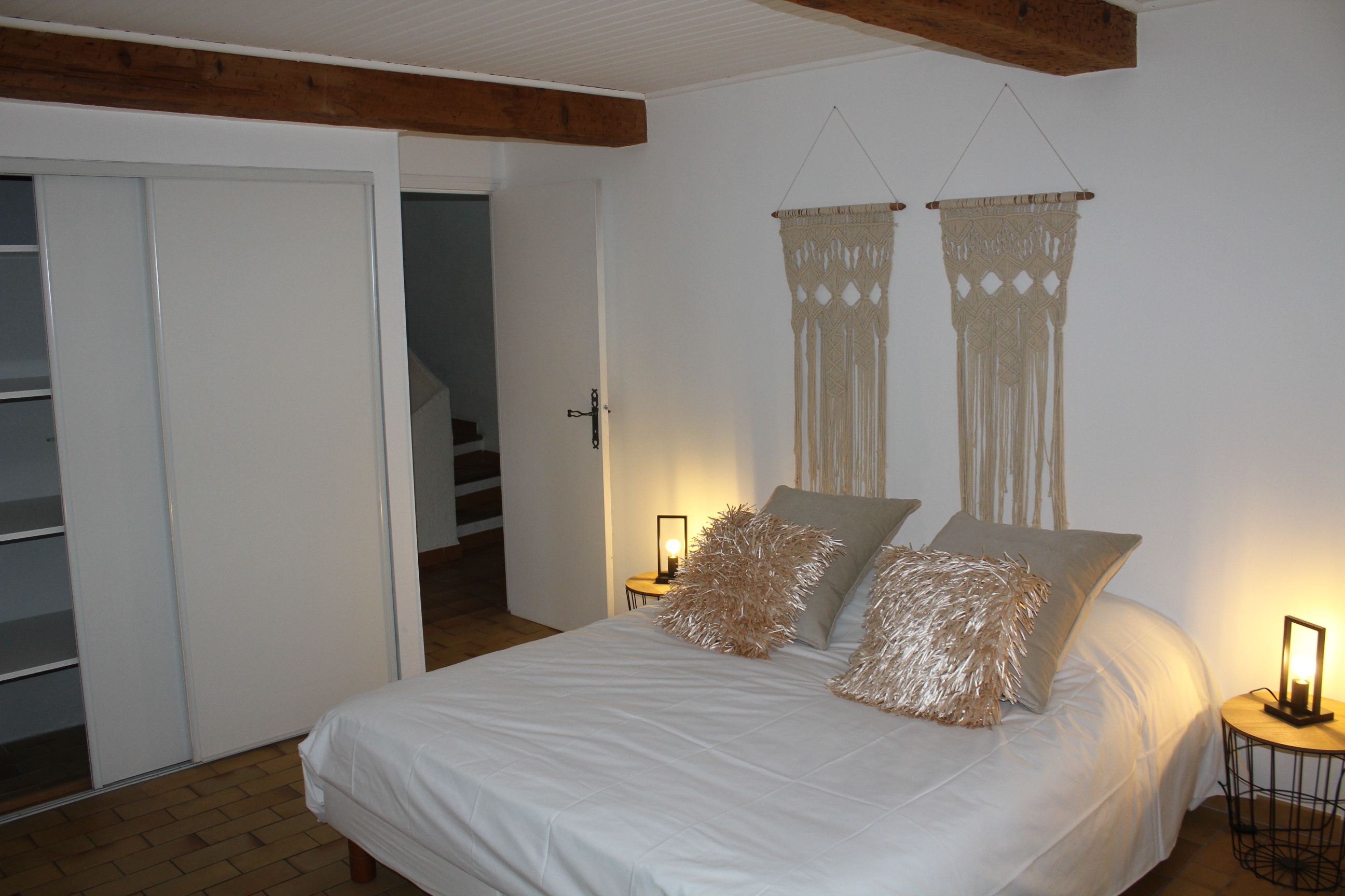 Au 1er étage, le palier dessert une grande chambre parentale de plus de 15m2 donnant sur la ruelle avec un grand lit et ses placards puis une deuxième petite chambre d'environ 8m2 avec un grand lit plus placard.
